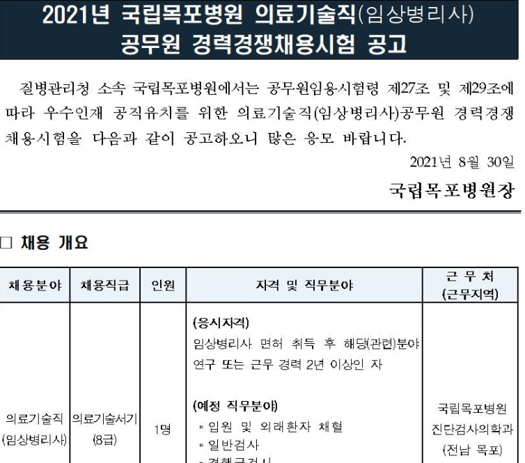 이번 포스트는 경찰병원을 비롯한 공무원 임상병리사에 대해 다뤄보겠습니다.